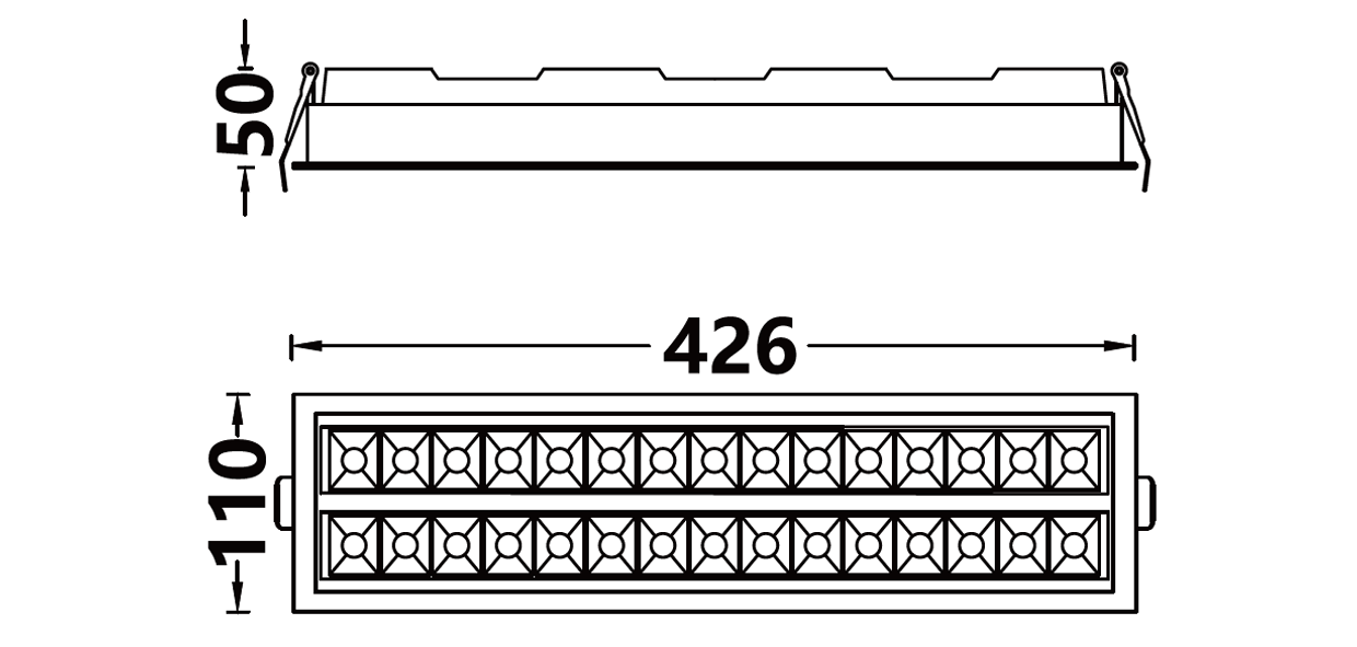| 嵌 ⼊ 式 可 调 条 形 筒 灯 | EL35328-30*2 | 60W | 45V/700mA | Ra>90 | 45° | 3000K | 13507CD |