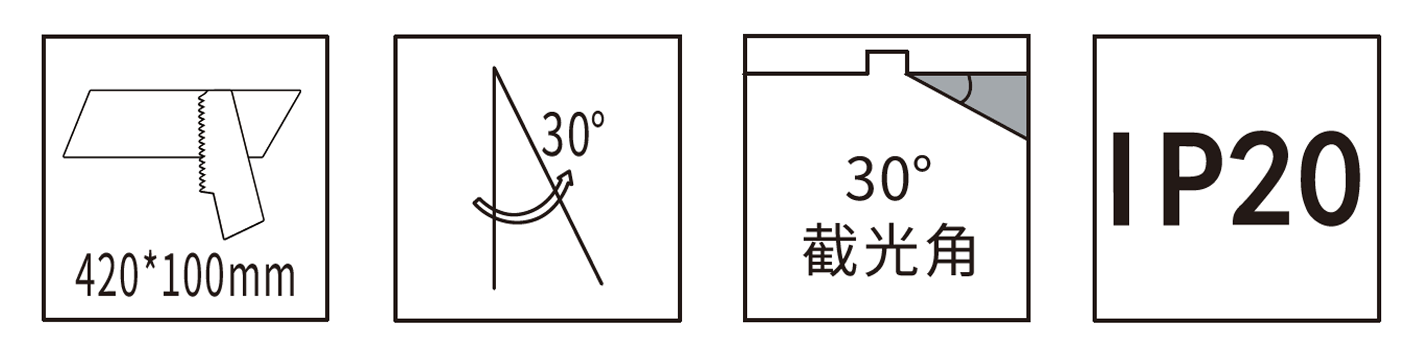 | 嵌 ⼊ 式 可 调 条 形 筒 灯 | EL35328-30*1.5 | 45W | 45V/500mA | Ra>90 | 45° | 3000K | 10485CD | |||